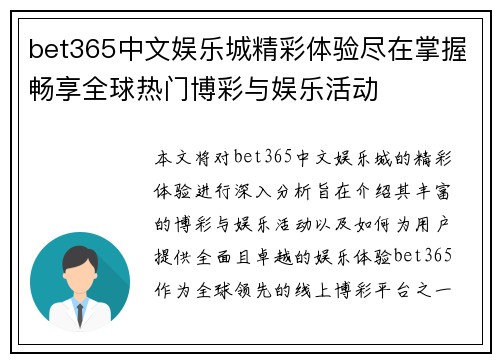 本文将对bet365中文娱乐城的精彩体验进行深入分析,旨在介绍其丰富的博彩与娱乐活动,以及如何为用户提供全面且卓越的娱乐体验。bet365作为全球领先的线上博彩平台之一,凭借其广泛的游戏种类、便捷的操作界面以及创新的用户服务,成为了玩家们的首选平台之一。通过从四个主要方面进行阐述,本文将全面展示bet365中文娱乐城的独特魅力与优势。首先,我们将探讨平台的博彩项目,包括体育博彩、电子竞技和真人娱乐场等。接着,文章将分析bet365的创新技术与平台设计,如何提升用户体验。第三部分将聚焦平台的安全性与信任保障,确保每一位玩家都能放心享受娱乐。最后,我们将讨论bet365中文娱乐城如何在全球范围内吸引多元化的用户,并提供个性化的娱乐服务。