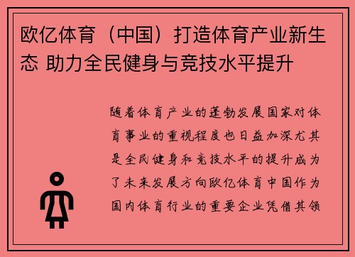 随着体育产业的蓬勃发展,国家对体育事业的重视程度也日益加深,尤其是全民健身和竞技水平的提升成为了未来发展方向。欧亿体育(中国)作为国内体育行业的重要企业,凭借其领先的技术和创新理念,致力于推动体育产业的新生态建设。本文将详细探讨欧亿体育(中国)在打造体育产业新生态、助力全民健身与竞技水平提升方面的具体举措与贡献。文章从四个方面展开论述,分别是:欧亿体育(中国)如何通过技术创新推动体育产业升级、如何助力全民健身普及、如何提升竞技体育的水平、以及如何整合体育资源助力产业链发展。最后,结合欧亿体育(中国)的实践经验,归纳总结其在体育产业发展中的重要作用与未来发展潜力。